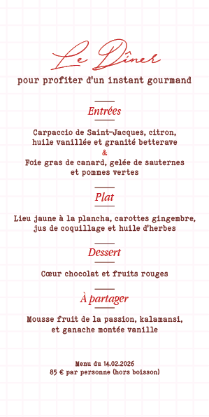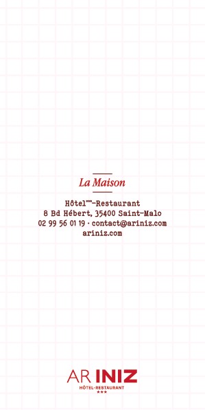 Bien sûr, avec une telle vue mer et la proximité des remparts de la Cité corsaire les produits de la mer, poissons et crustacés, sont les stars de la carte AR INIZ. Les spécialités bretonnes sont nombreuses. Les assiettes du chef exaltent les saveurs locales, jouant l’accord parfait entre terre et mer.